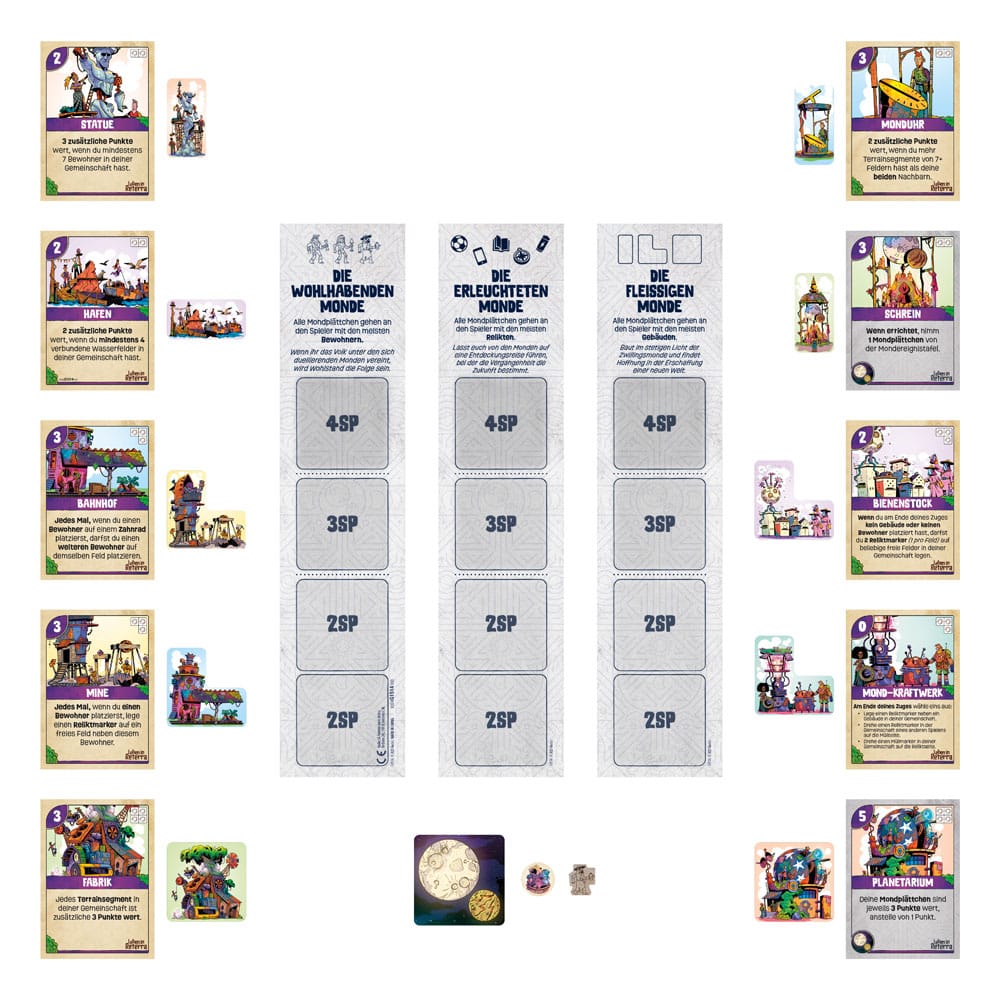 Enthält 30 Mondplättchen, 10 doppelseitige Gebäudekarten, 54 Gebäudeplättchen, 2 Aufbewahrungsfächer, 3 Mondereignistafeln, 16 Bewohnerfiguren, 10 Müll-/Reliktmarker und eine Spielanleitung.