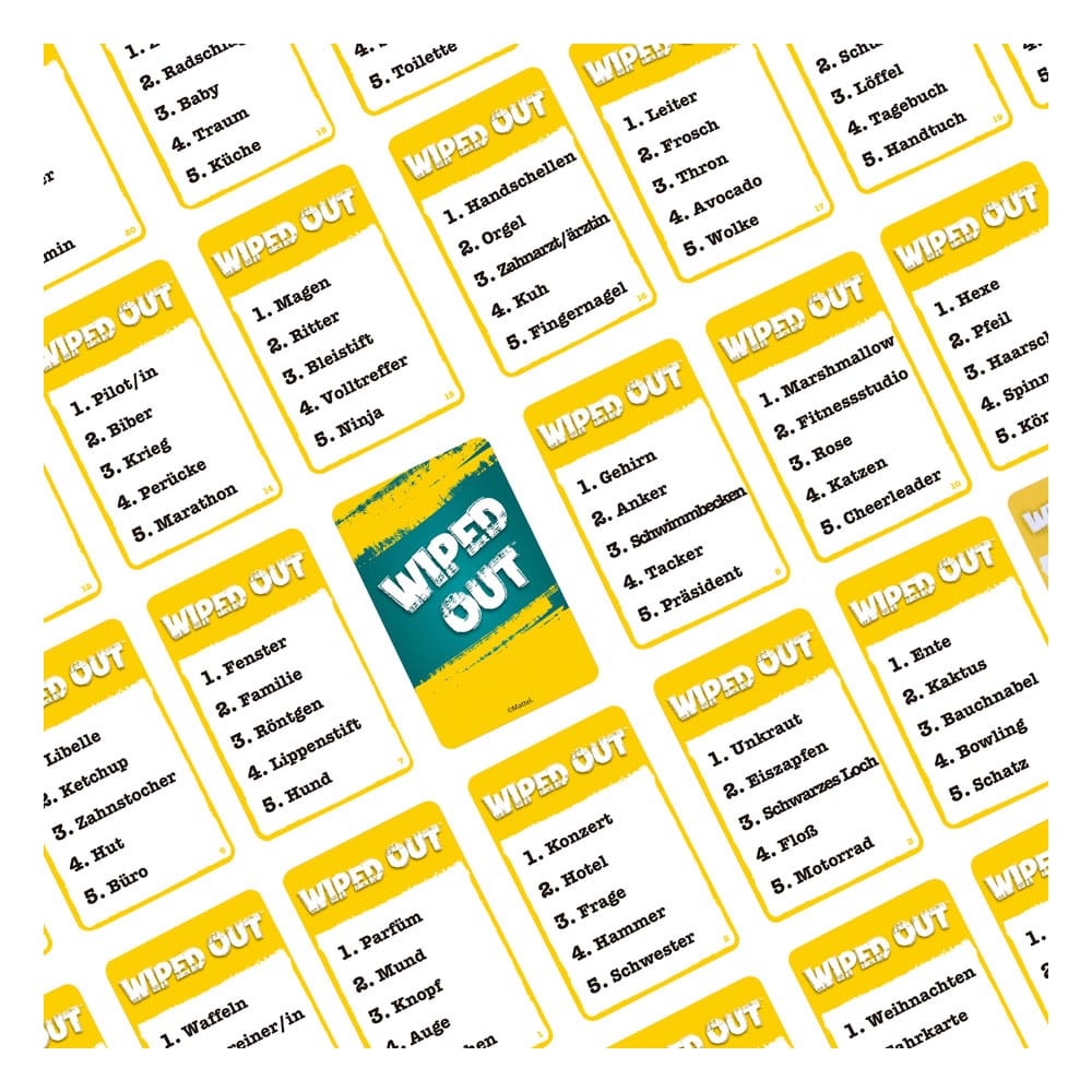Bei dem Partyspiel Wiped Out" können Spieler die Konkurrenz auslöschen. In jeder Runde kann man sich mit einem anderen Mitspieler zusammentun, um ein Geheimwort zu erraten. Dank einer stylischen Brille bleibt der Ratende im Dunkeln, während der Partner 5 Hinweise aufschreibt. Aber aufgepasst! Die anderen Spieler können das Team sabotieren und bis zu drei Hinweise löschen. Abweichungen in Farbe und Gestaltung vorbehalten.